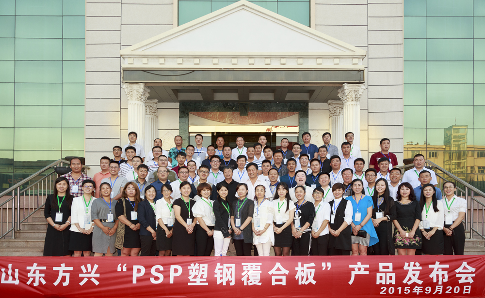 2015年9月20日,山东方兴建筑材料有限公司在莱州宾馆隆重举行了“PSP塑钢耐腐板”新产品发布会,公司分布在全国各地的销售人员和国际部业务人员参加了这次新品发布会,大家欢聚一堂,共同庆贺新产品的诞生。